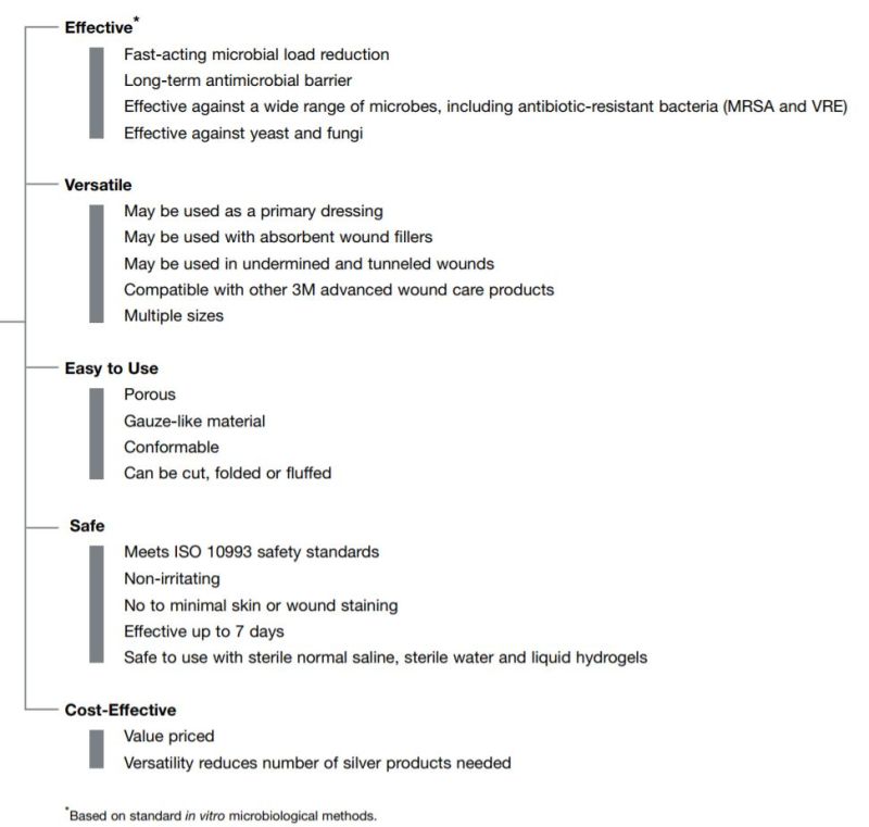 3M Tegaderm Ag Mesh Dressing with Silver is a nonwoven gauze dressing that contains silver sulfate, 8 mg/g of dressing. Silver sulfate released as silver ions within the dressing creates an effective barrier for up to 7 days. The soft, absorbent dressing is supplied sterile and may be custom cut. The porous, non-occlusive dressing conforms to the wound base and wicks drainage into the dressing where the silver ions are available to reduce the number of bacteria and yeast that are absorbed into the dressing.